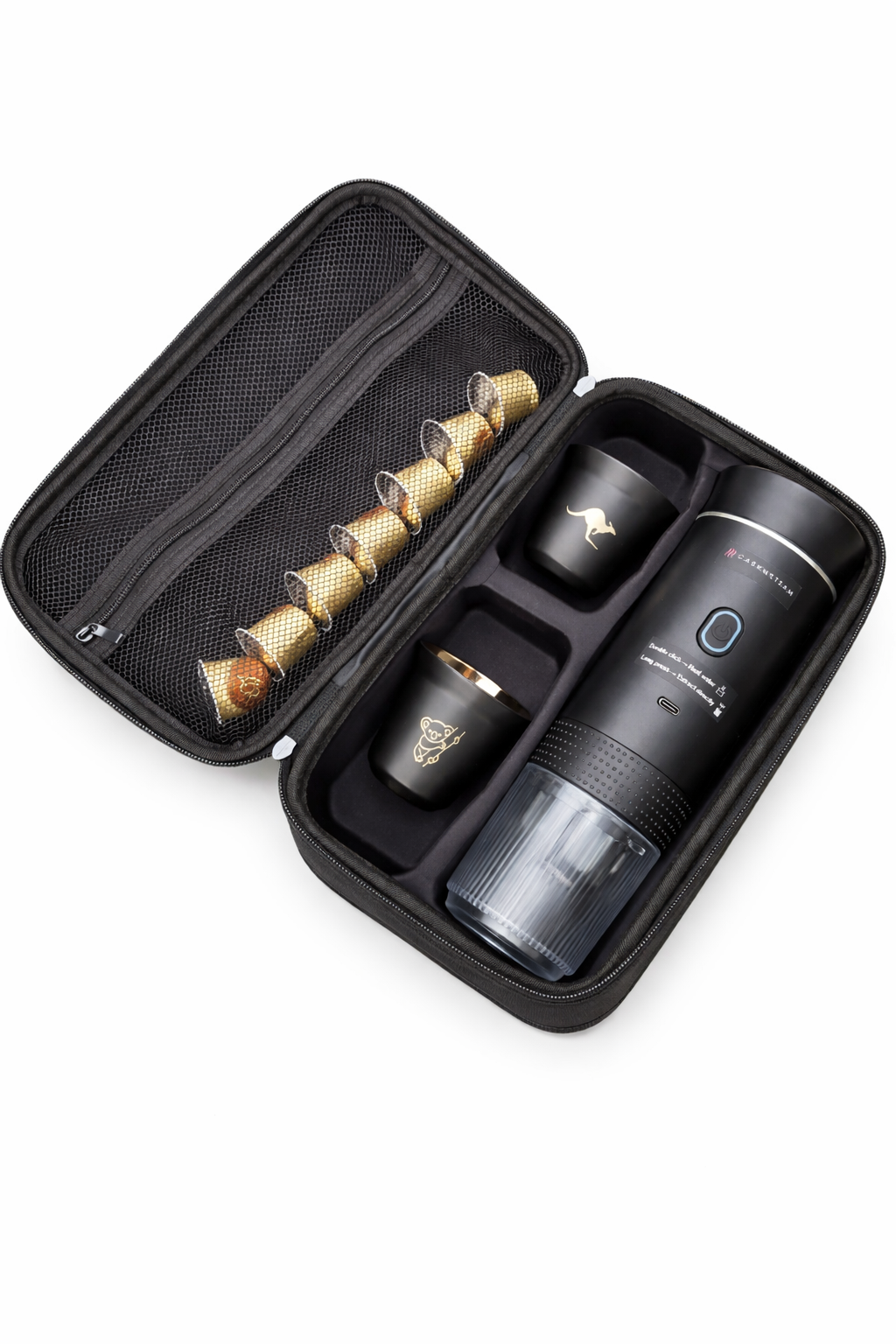 - Compact Travel Case: Includes cups, filters, and accessories